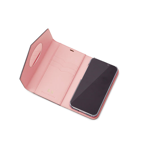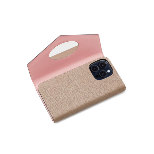 - 仕様:本革手帳型スマホケース、背面ポケット×1、カードポケット×3、フリーポケット×1、化粧ミラー×1