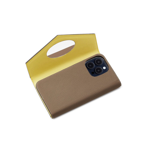 - 仕様:本革手帳型スマホケース、背面ポケット×1、カードポケット×3、フリーポケット×1、化粧ミラー×1