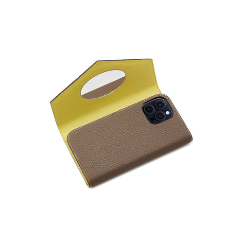 - 仕様:本革手帳型スマホケース、背面ポケット×1、カードポケット×4、フリーポケット×1、化粧ミラー×1