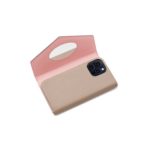 - 仕様:本革手帳型スマホケース、背面ポケット×1、カードポケット×4、フリーポケット×1、化粧ミラー×1