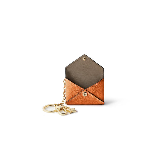 • シュリンクレザー製エンベロップ型の小物入れと星のチャームがついたキーホルダー。