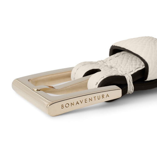 - イタリアで一つ一つ丁寧に仕立て上げられたスクエアバックルはフォーマルな印象でありながら、サイドを雫型の曲線に仕上げたエレガントなデザイン。