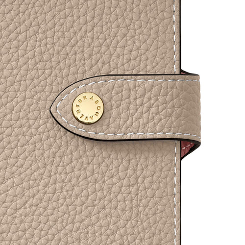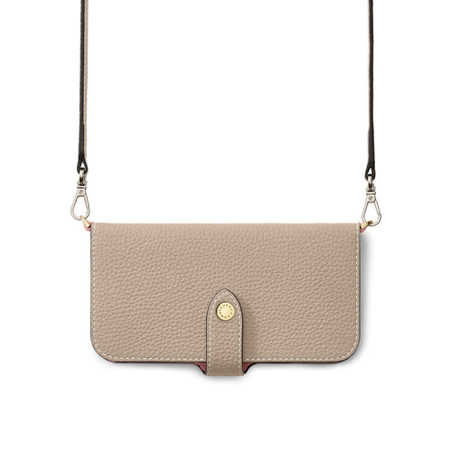 柔らかな手触りと美しいシボ感が魅力のレザー。キズや汚れが目立ちにくく、日常使いにも最適です。 -