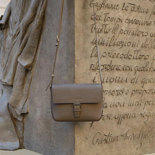 歴史を物語る石畳の路地と、クラシックな建築が連なるイタリアの街並み。ドゥオーモの丸屋根、路地裏に差し込む光、石造りの連なる柔らかなアーチ、歴史を包み込む中庭の曲線、そんな風景からインスピレーションを受けたメタルパーツが、ミニマルでファンクショナルなバッグに輝きを添えます。