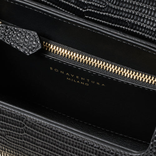 • 落ち着いた艶と美しい陰影が魅力のエンボスリザードレザーを採用。