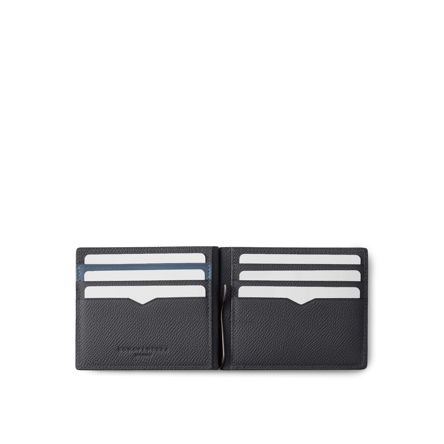左右に3つずつのカードスロット、背面にコインケース、レシートやお札をスマートに収納できるビルクリップを備えたシンプルかつ機能的な設計です。 -